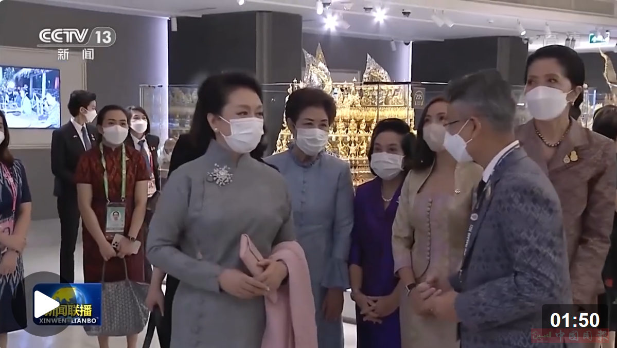 当地时间18日上午,应泰国总理夫人娜拉蓬邀请,国家主席习近平夫人彭丽媛同参加亚太经合组织第二十九次领导人非正式会议的部分经济体领导人及代表的配偶共同参观大城府国家艺术博物馆。