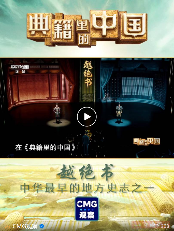 中央广播电视总台大型文化节目《典籍里的中国》第二季第五期《越绝书》,开启这部内容扣人心弦却充满谜团的“奇书”“绝书”,用地方志这一全新打开方式,让历史记载与山川河湖中孕育传承的生命轨迹逐渐重合,让古今相通的智慧与热血在我们心中久久回荡。