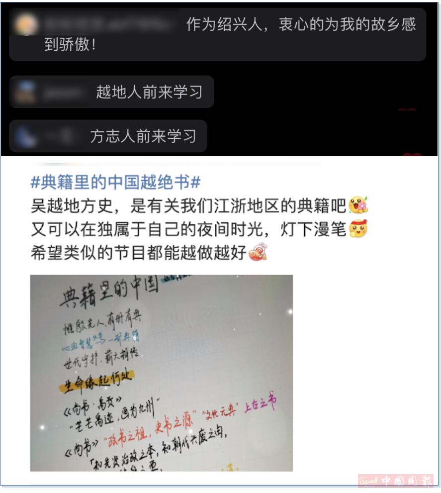 正如本期节目中的铿锵一问:无四方,何以中国?生于吴越之地的人们,能从《越绝书》中看到自己家乡千年前曾经历的风云变幻。我国历来重视方志编修工作,新时代的地方志书,同样凝结着一代代编纂工作者的心血与汗水。方志文化,薪火相传,绵延不绝,不负前人、不负今人、不负家乡,也不负中国辉煌的历史。