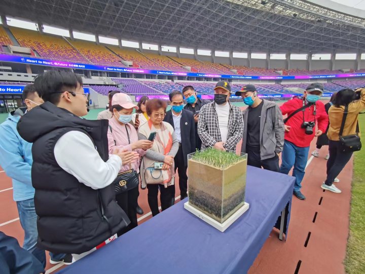 在黄龙体育中心主体育场,记者们发现足球场的草坪踩起来和普通的不大一样。工作人员告诉记者们:“改造后的足球场使用了国际上最先进的锚固草坪,这种草坪通过将自然草坪与人造草纤维结合,能使其更牢固,使用后的恢复能力也更强,黄龙体育场的5.5万多个座椅全部进行了更换,采用了更具现代律动感的色调,并将黄龙新LOGO和谐融入。