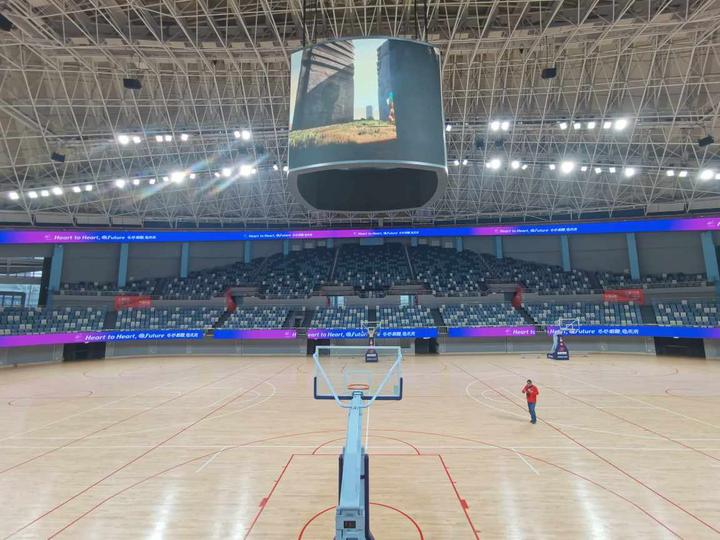 黄龙体育中心体育馆场馆正上方悬挂了一个“大家伙”——四面面积共206平方米的超高清斗屏,重达14吨。和主体育场一样,体育馆内也安装了上下两道环屏。上环屏长约246米,下环屏长约143米。赛时,环屏可播放字幕、画面等,有利于提升观赛氛围。