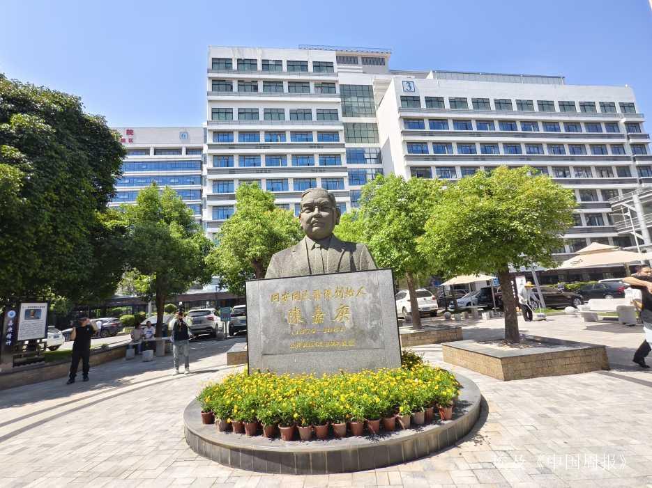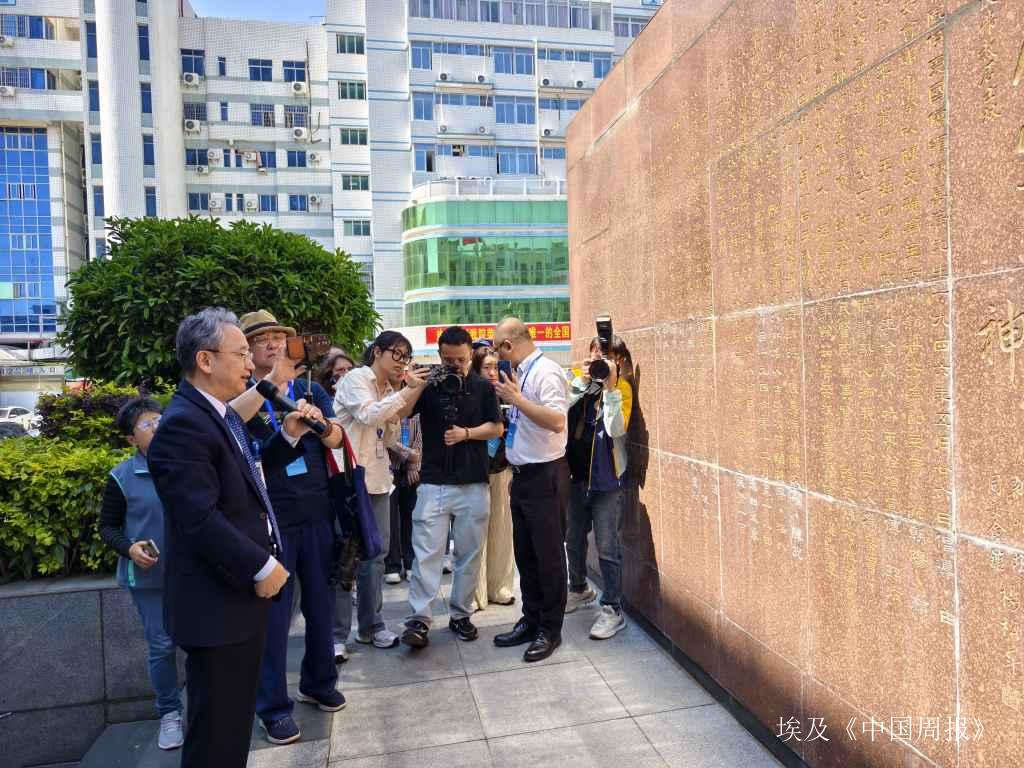 海外华文媒体福建采访团在听取厦门同民医院黄继义院长讲述陈嘉庚先生捐建医院的故事
