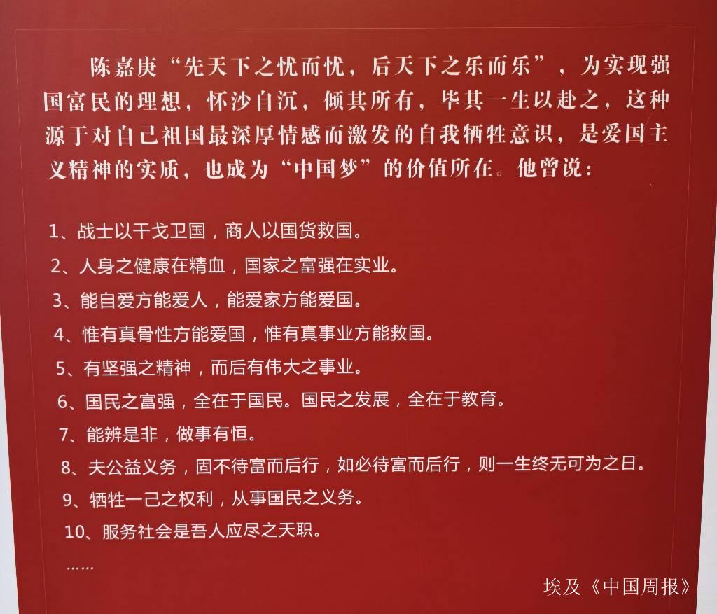 正如陈嘉庚在1946年撰写的《南侨回忆录弁言》中写道的:“公——永无止境的奉献;忠——永不动摇的爱国;毅——永不言败的坚强;诚——永不毁诺的铮铮傲骨。”