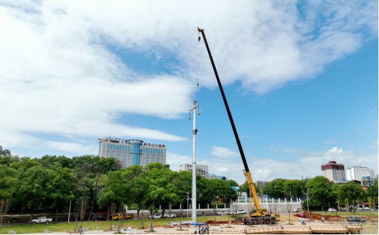 国网湖南电力工作人员在酃湖公园对110千伏酃和线杆迁新建线路开展组塔作业。汪继生 摄