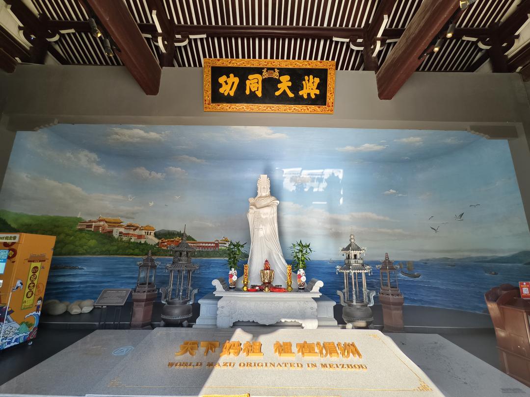 序厅中,3.23米高的汉白玉妈祖雕像庄严肃穆。