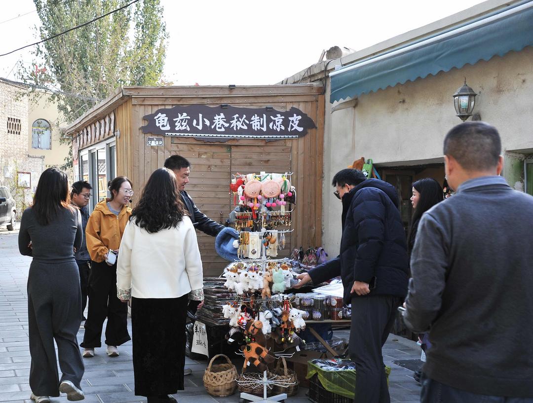 欢快的乐声突然响起,身着民族服饰的表演者们踏着节奏巡游而来,龟兹乐舞的灵动身姿复刻了克孜尔石窟壁画中“天宫伎乐”的神韵。媒体代表们纷纷加入即兴舞蹈圈,与当地群众一同起舞,欢声笑语洒满街巷,在文创店的柜台前,葫芦雕刻、瓷盘彩绘等手工艺品琳琅满目,而烤包子的香气与馕房的麦香交织飘散,构成最动人的市井气息。