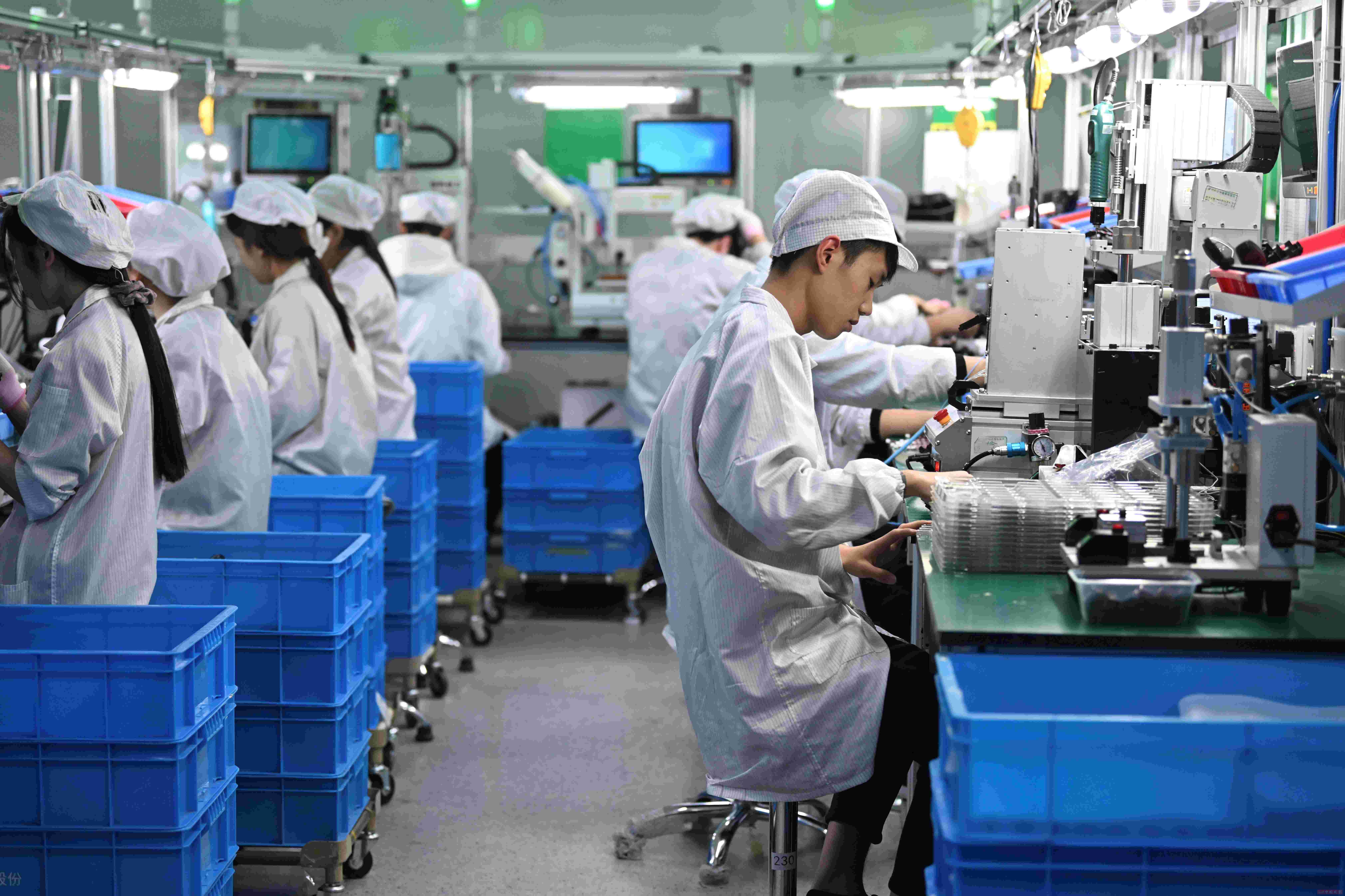 11月17日,休宁县昌辉汽车电器(黄山)股份公司的生产车间内,工人们正在组装汽车配件。中新社记者韩苏原 摄