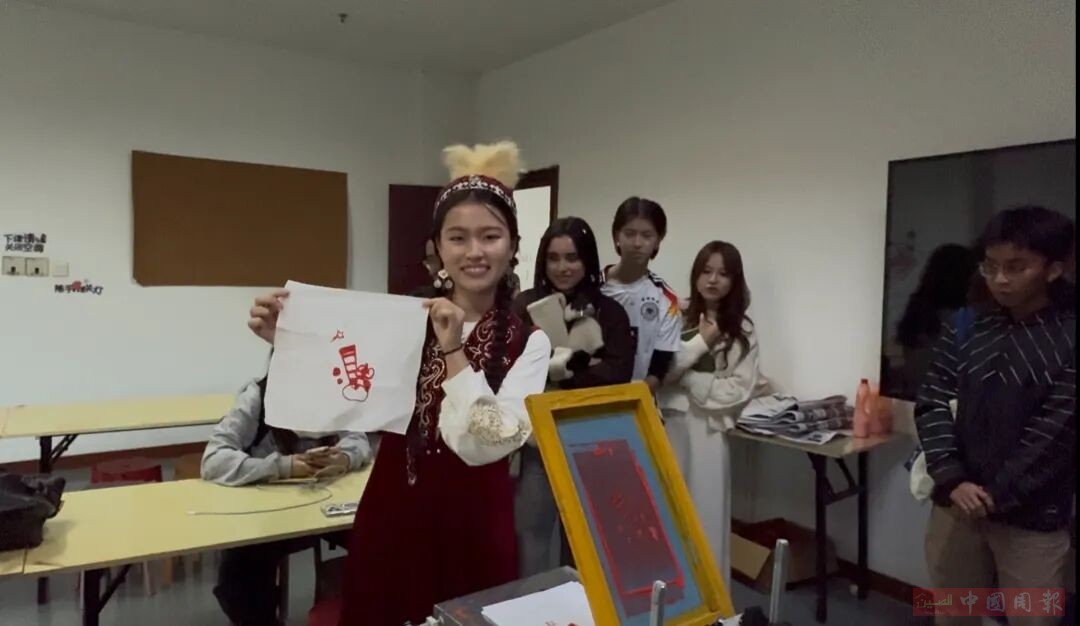 随后,留学生们结合丝网拓印技术与手绘,将中国印刷元素与本国文化符号创意融合,制作出独一无二的“跨文化手帕”。