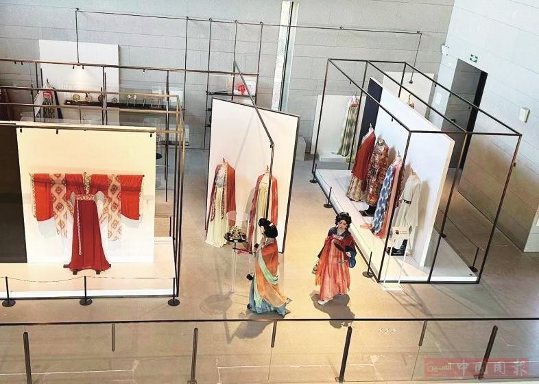 7月28日,在位于体育馆东路北侧的安仁坊遗址展示馆,唐代华服吸引了身着唐装的游客穿行其中。这里展示的唐代煎茶器具和唐人的服装、首饰、发型、糕点等让观众身临其境,感受大唐文化风貌。
