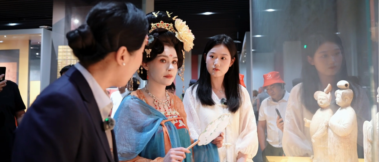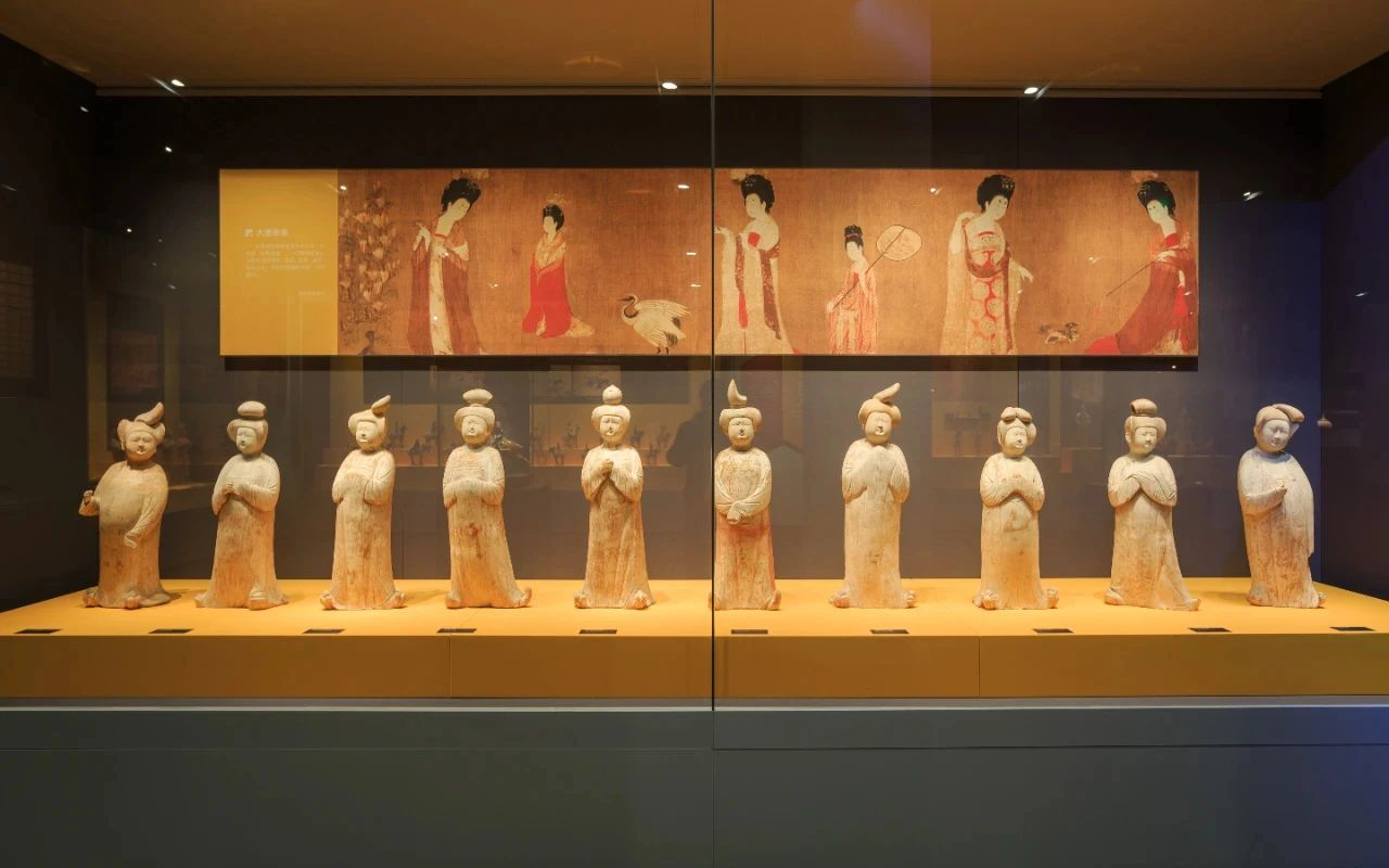 “我找到了1300年前的潮流风向标!”留学生龙智慧在西安博物院兴奋打卡。镜头前,一尊盛唐女俑正演绎着千年前的OOTD:高腰襦裙将裙腰提至胸线以上,搭配轻薄半臂短衫,曳地长裙如云流动,红紫绿三色在石刻上晕染出“裙裾扫落梅”的诗意。讲解员风趣解读:"这简直是唐代版高腰裤,丰腴美学与显高秘籍的完美结合!"