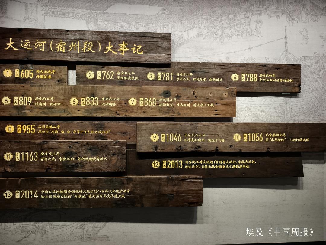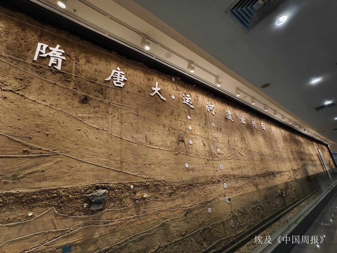 在博物馆内部连廊,展示了目前全国面积最大、文化层最全、结构最为完整的隋唐大运河遗址剖面。遗址剖面长54米,高4米,包含南堤、北堤、主副河道以及隋、唐、宋、金、元、明、清时期各个时代地层,一眼千年,把观众带入唐宋时期的历史长河,带领大家直观感受运河的开凿、使用、疏浚到废弃的全过程。