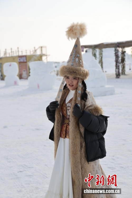 中新社发 毛建军 摄1月5日,身着哈萨克族服装的姑娘在阿勒泰海上魔鬼城留影。