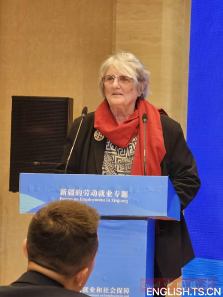 Ella Rule speaks at the International Symposium on Employment and Social Security in Xinjiang, which was held in Urumqi, northwest China's Xinjiang Uygur Autonomous Region.