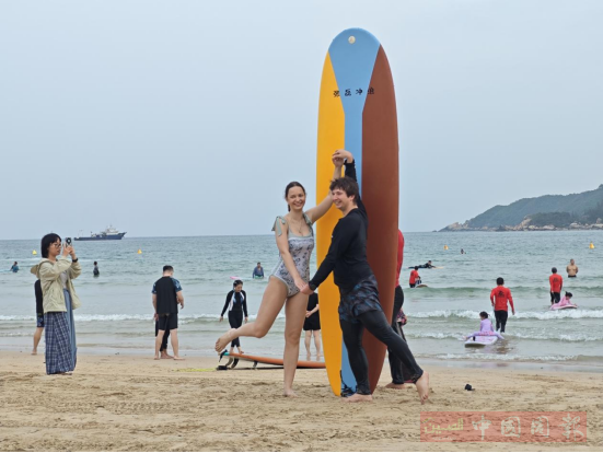 4月23日,海南三亚,外籍游客在后海体验冲浪并合影。(第六届亚洲沙滩运动会组委会 供图)