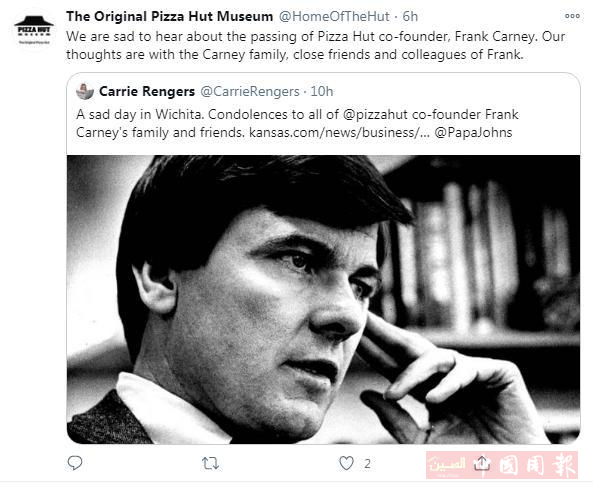 综合报道,当地时间12月2日,美国披萨连锁品牌必胜客创始人之一弗兰克·卡尼(Frank Carney)因肺炎病逝,享年82岁。他与哥哥于1958年在堪萨斯州威奇托市,开始携手创建必胜客“披萨帝国”。