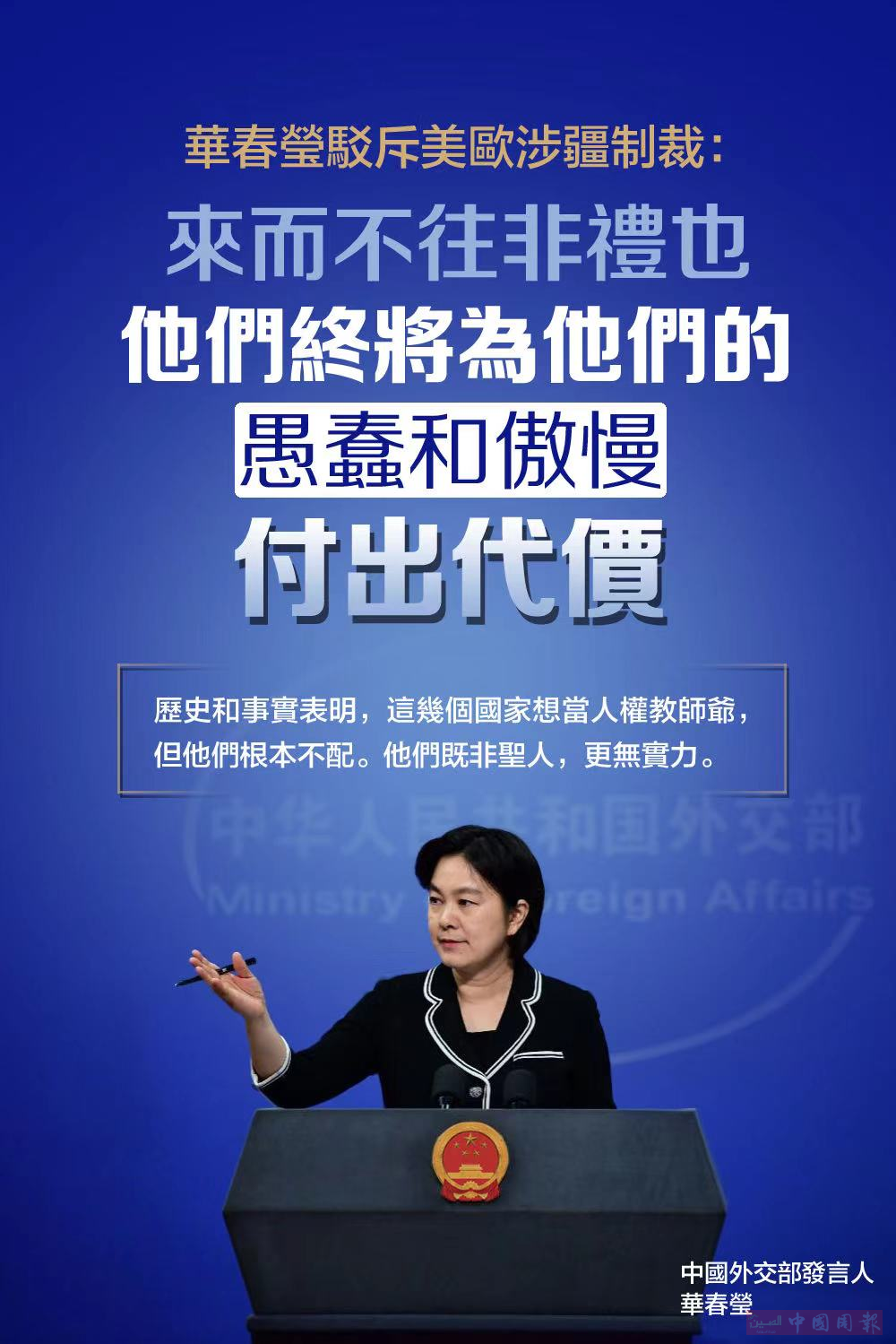 华春莹强调,奉劝他们不要低估中国人民捍卫国家利益与民族尊严的坚定意志。“来而不往非礼也”,他们终将为他们的愚蠢和傲慢付出代价。