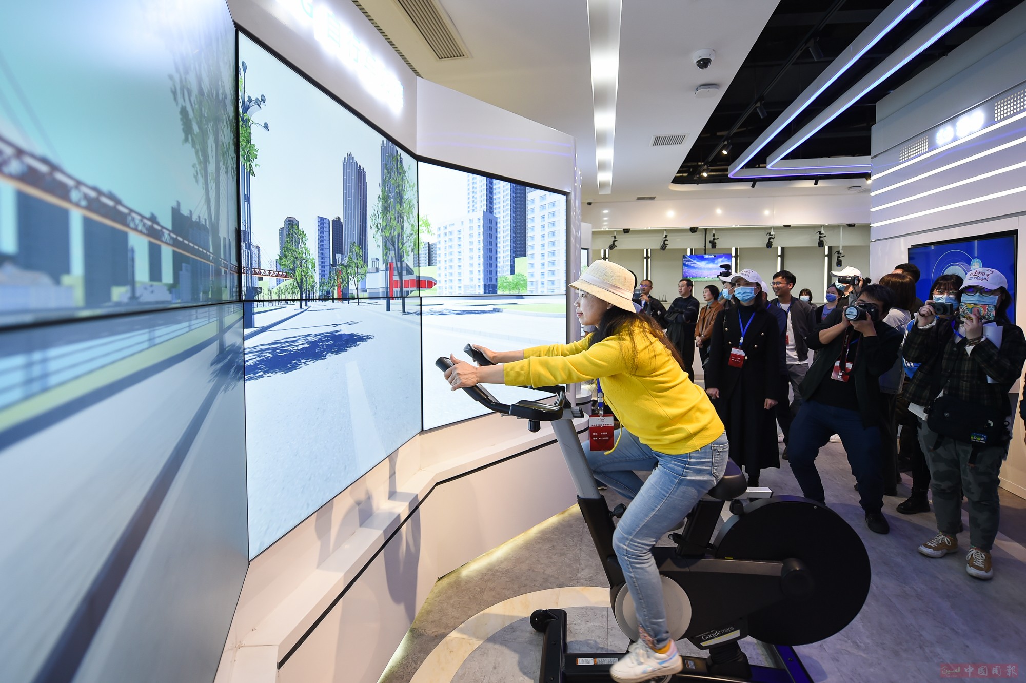 图为参访人员在重庆礼嘉智慧公园内体验5G自行车竞速。 何蓬磊 摄