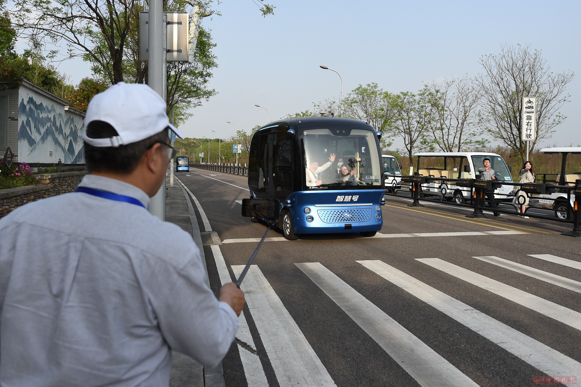 图为无人驾驶驾驶车吸引了参访人员的注意。 何蓬磊 摄