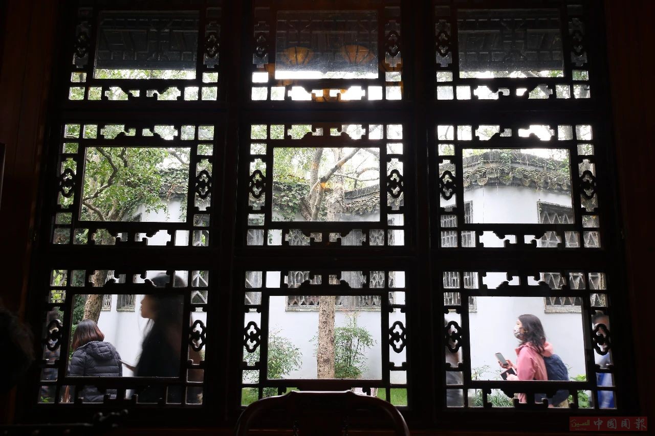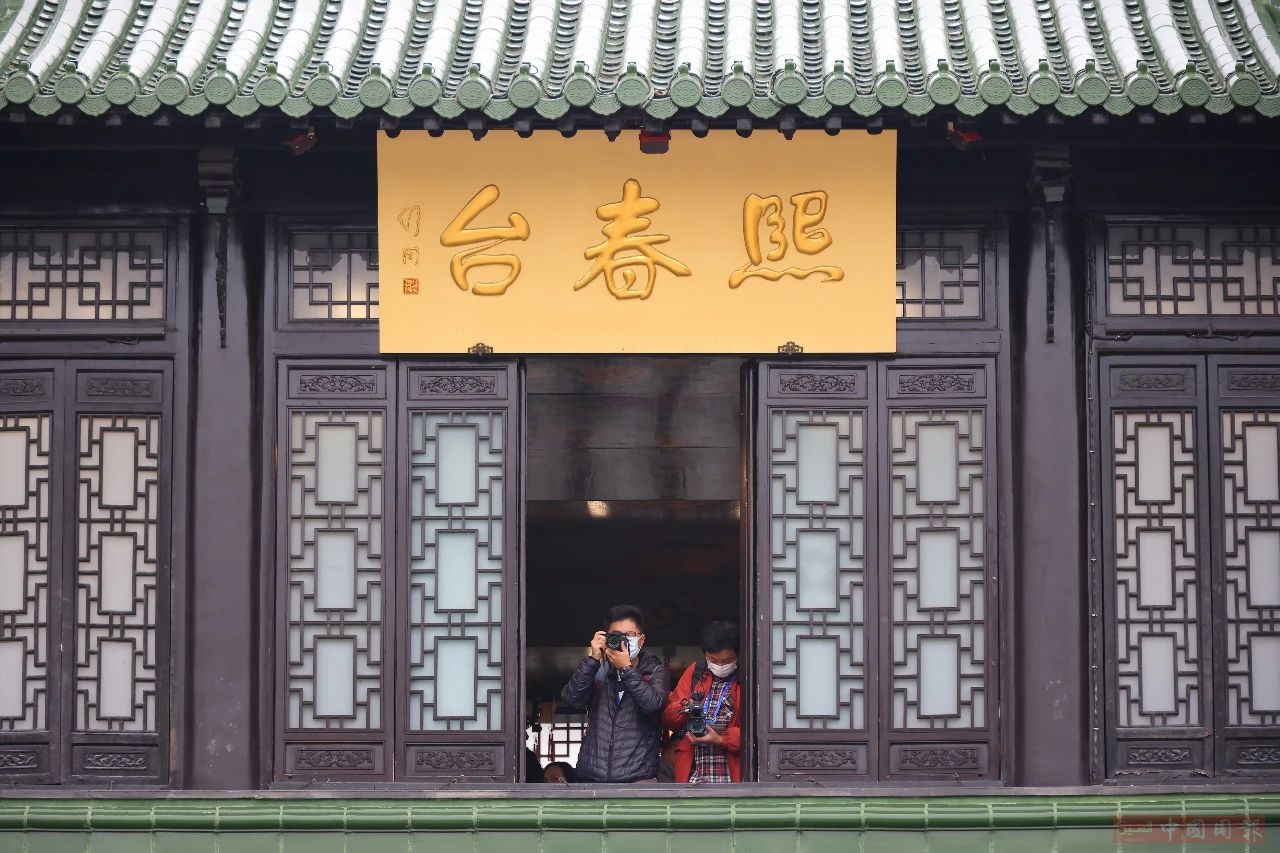 采访团成员在扬州瘦西湖熙春台内拍摄湖畔景致。