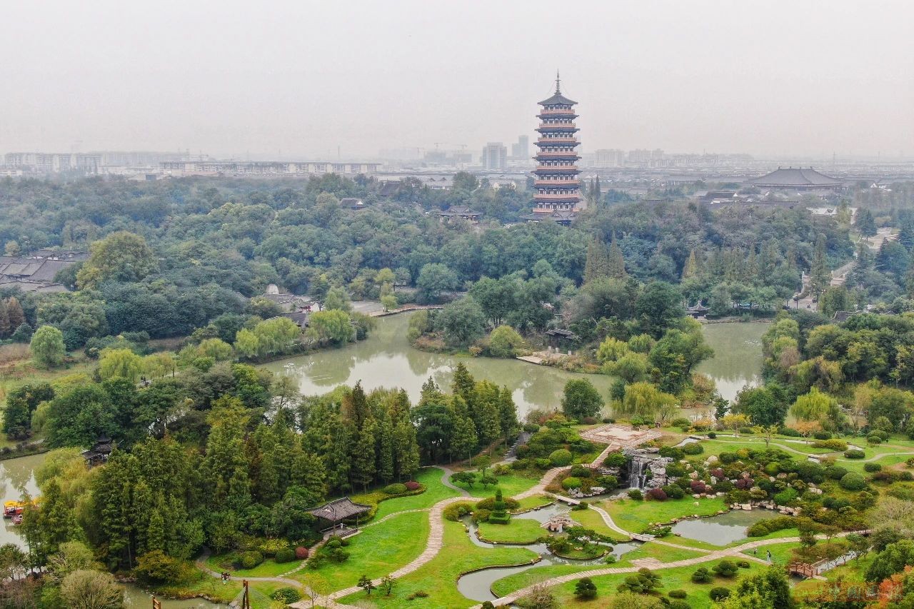 航拍扬州瘦西湖畔的大明寺平山堂。(无人机照片)