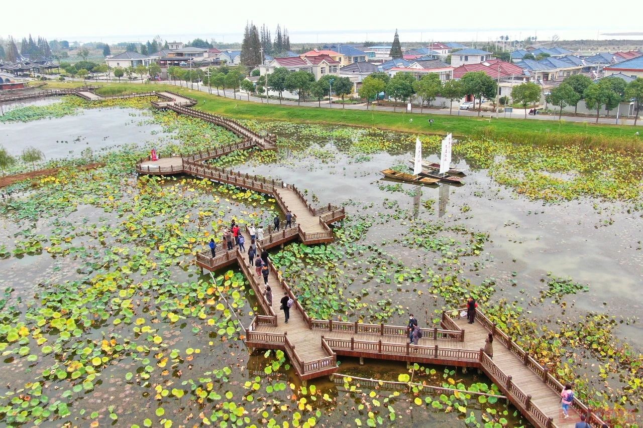 30余家海内外媒体行走在扬州“网红渔村”——沿湖村,看渔村蝶变、听渔民新说。(无人机照片)